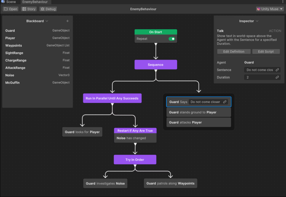 即時設定與Muse Behavior的角色互動。只需描述需要的行為,Unity Muse將在Unity編輯器中建立行為樹。(Unity. (2025, May 12). Bring Your Ideas to Life Faster with In-Editor AI. Unity.)